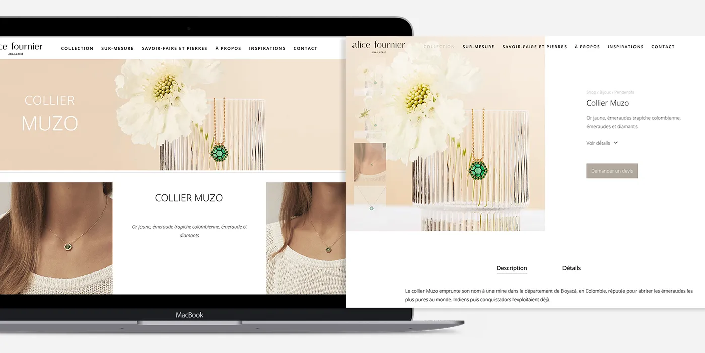 L’interface a été conçue pour sublimer les créations joaillières d’Alice Fournier à travers des visuels haute définition qui révèlent chaque détail des pièces. Les descriptions détaillées et les contenus engageants permettent de transmettre l’histoire de la marque, son inspiration et son expertise.