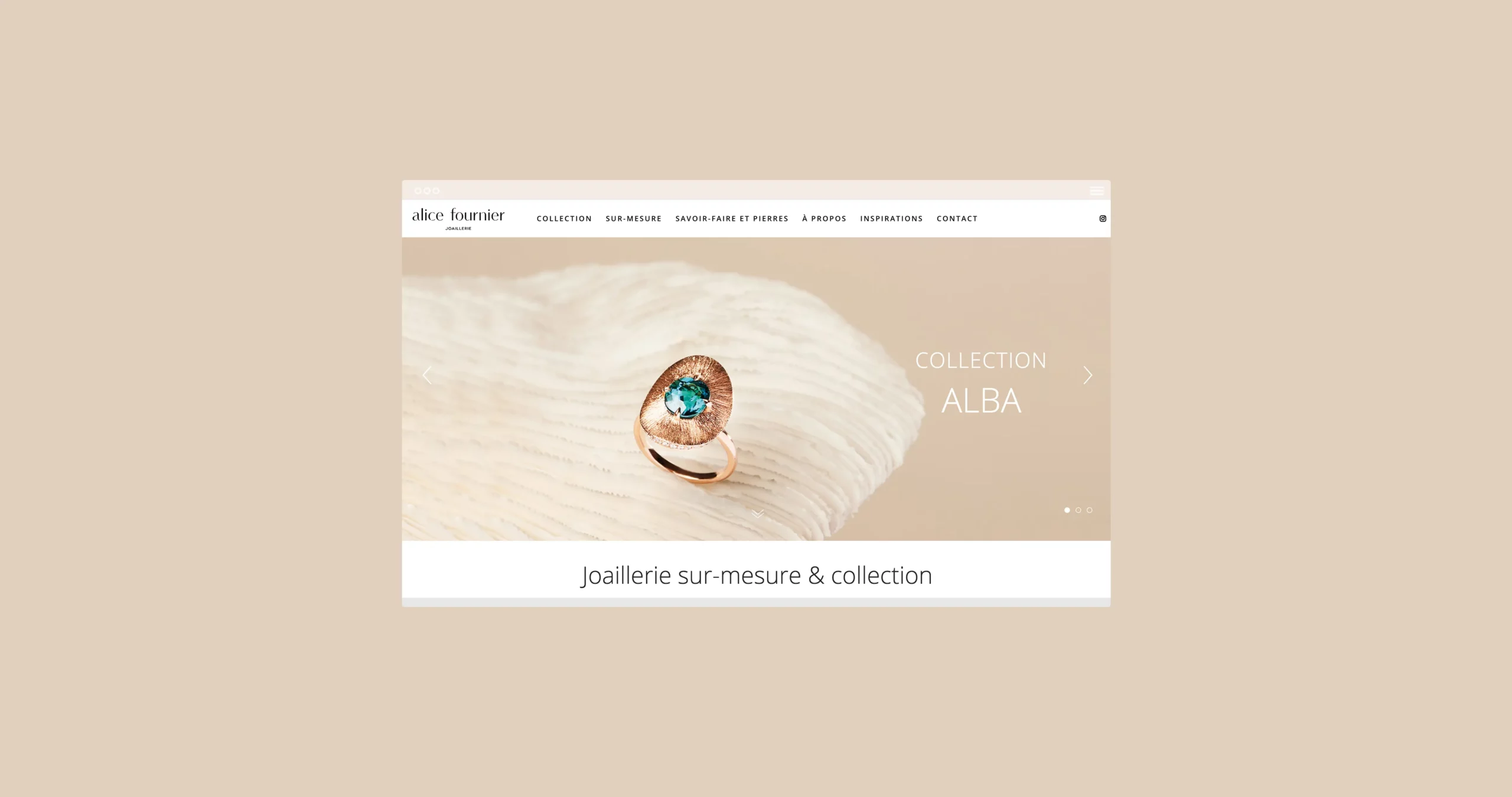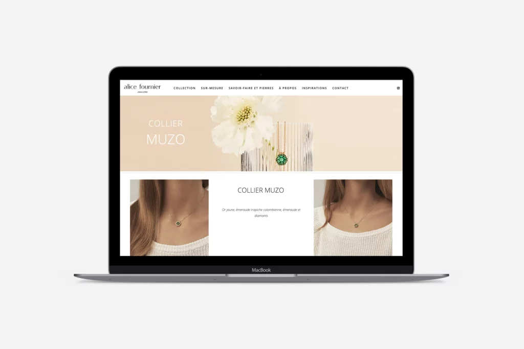 Le site d’Alice Fournier a été pensé comme un écrin mettant en valeur chaque création. Le design minimaliste et sophistiqué met en avant la délicatesse des bijoux, avec une palette de couleurs douces et des typographies élégantes.