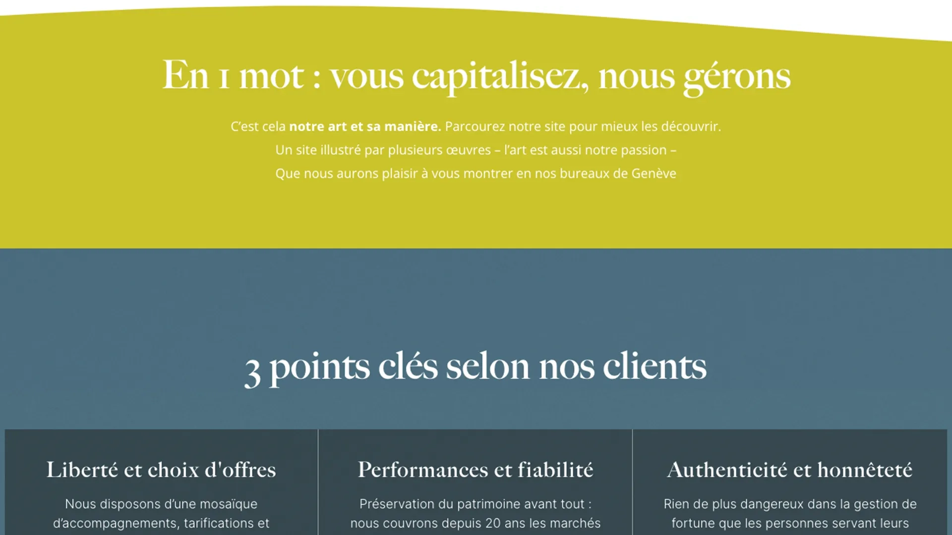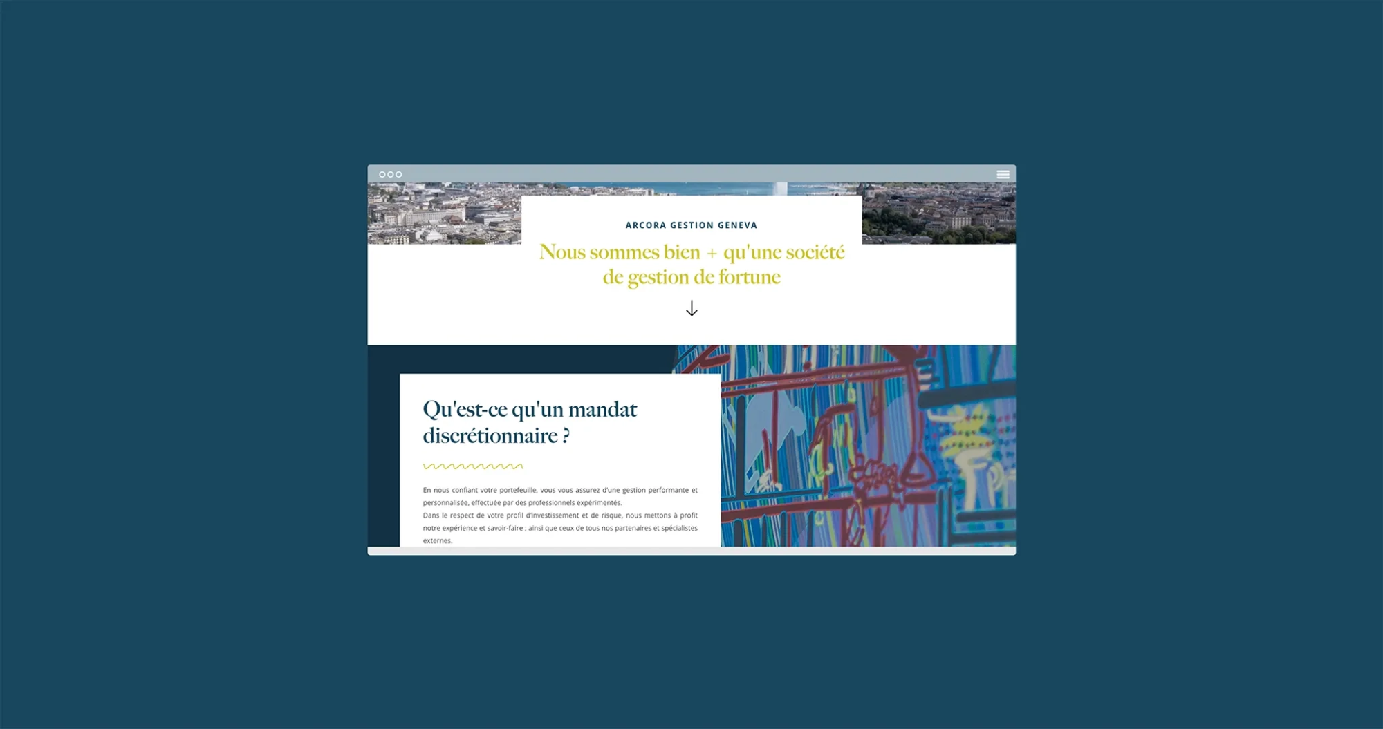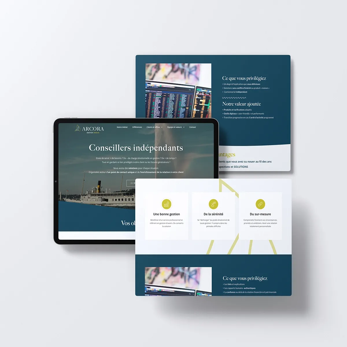 Le travail sur le contenu a permis de mettre en valeur les grands piliers de l’offre Arcora, à savoir la gestion discrétionnaire sur mesure, le conseil en investissement indépendant, ainsi que l’approche family office et patrimoniale. Chaque page a été conçue pour refléter une relation client personnalisée et attentive, tout en conservant un ton institutionnel cohérent avec les exigences du secteur financier suisse.