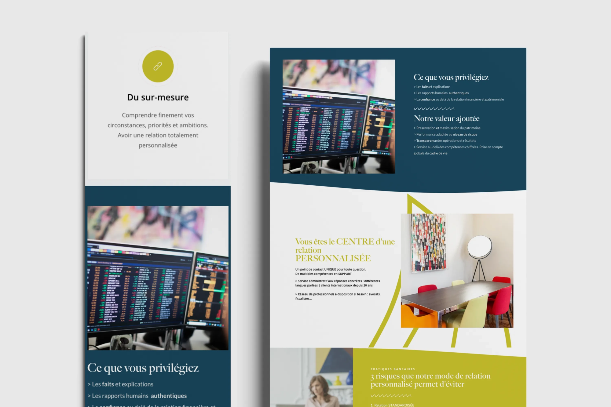 Le projet de refonte du site internet pour ce cabinet de gestion de patrimoine basé à Genève a été pensé pour renforcer la crédibilité de l’entreprise et améliorer l’expérience utilisateur. Cette refonte du site internet de cabinet de gestion de patrimoine s’est accompagnée d’un travail d’identité visuelle complet, dans le but d’aligner l’image de l’entreprise avec les standards du secteur financier suisse.